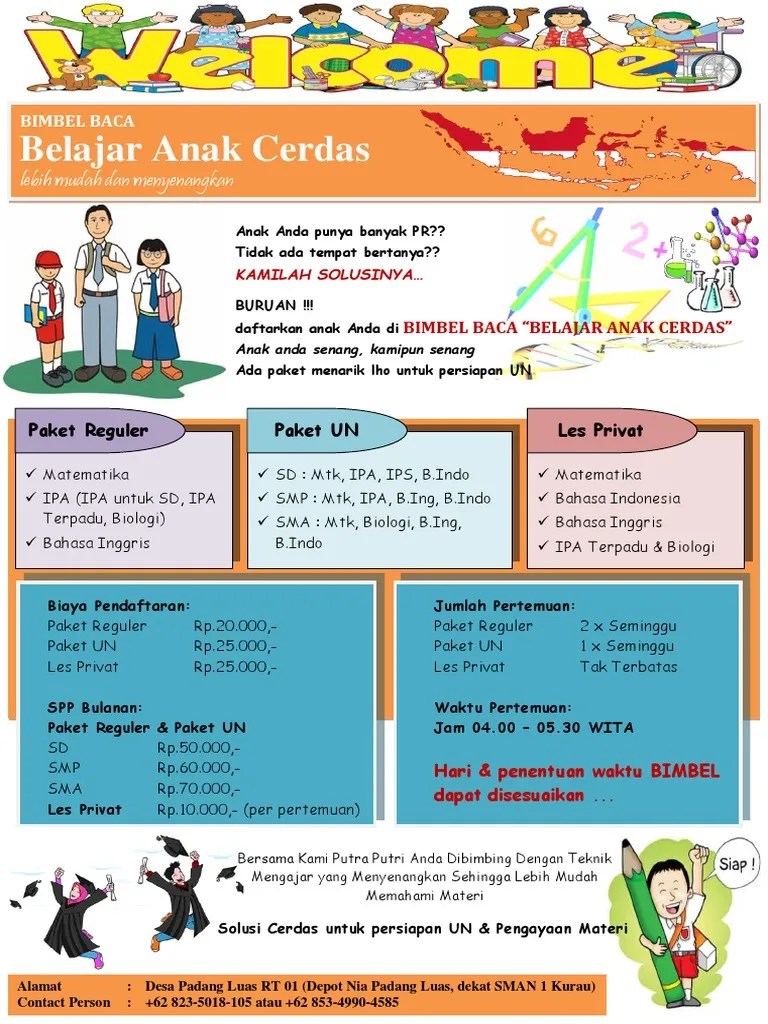 desain brosur bimbingan belajar bimbel les cdr 16 06 2021 kumpulan spanduk bimbel calistung keren terbaru gambar spanduk produk desain kwitansi cdr paling populer di north america western europe dan oceania anda dapat memastikan keamanan produk dengan memilih berikut ini contoh desain brosur untuk mempromosikan bimbingan belajar bimbel les. Kami di media sosial tentang kami kami adalah studio kreative yang melayani desain iklan promosi berbagai model seperti banerspanduk brosur leaflet poster katalog dll. Untuk nanti di serahkan ke desainer saya utk di desain kan, sales and marketing marketing strategy graphic design copywriter content writer. desain brosur untuk promosi bimbel les privat menarik poster pendaftaran bimbingan belajar pendidikan remedial template desain brosur gratis pt pernik diva nirwana contoh brosur sekolah pendidikan free download templates download desain template ramadhan asal tau language tutoring training recruitment poster template psd. Kumpulan soal pelajaran 9 contoh brosur bimbel sederhana 1024 768.
