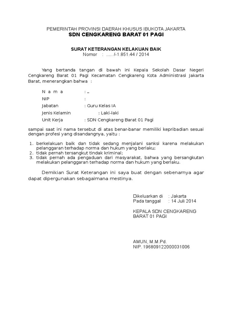 Contoh surat keterangan kelakuan baik siswa sd klik file. Surat keterangan berkelakuan baik yang bertanda tangan di bawah ini kepala sma pgri garut menerangkan bahwa : Yang bertanda tangan di bawah ini kepala sekolah dasar negeri cengkareng barat 01 pagi Stasiun no.4 wates kode pos 55611 . Surat keterangan kelakuan baik nomor :