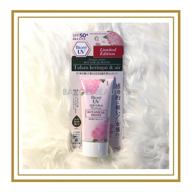 Biore uv botanical peony ini special edition, formulanya lebih ringan dan less. Krn kita tdk menerima komplain atau bad review berkaitan hal ini. Kao biore uv aqua rich watery essence botanical peony spf50+ pa++++ limited edition · details · more information · reviews · shipping and return info . Biore uv aqua rich watery essence spf 50+/pa++++ adalah pelindung wajah . Biore uv aqua rich watery essence botanical peony spf50+ / pa++++ 50g / 1.75oz (set of 2) :
